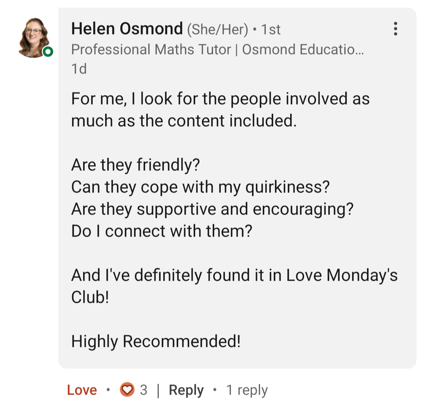 Helen is always available for support in the group and on messages. She encourages me to be more visible online and to market my group.